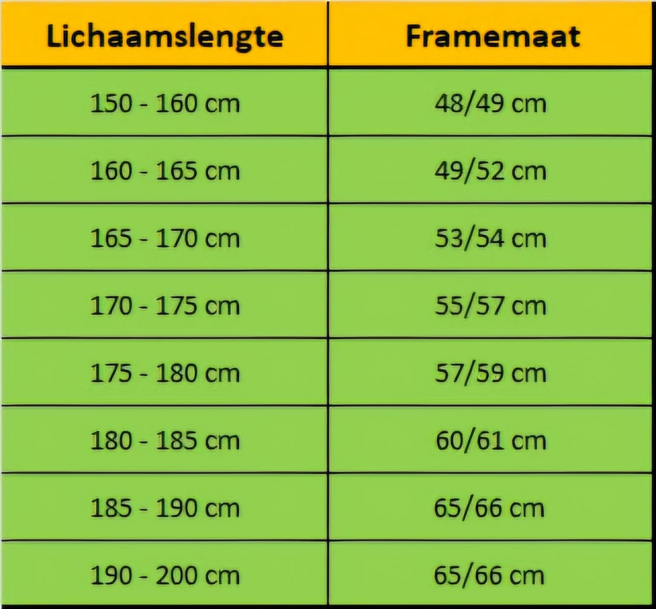 Kies jouw framemaat op basis van onze formule. Mocht je het niet zeker weten neem dan contact met ons op door te bellen of een whatsapp te sturen.